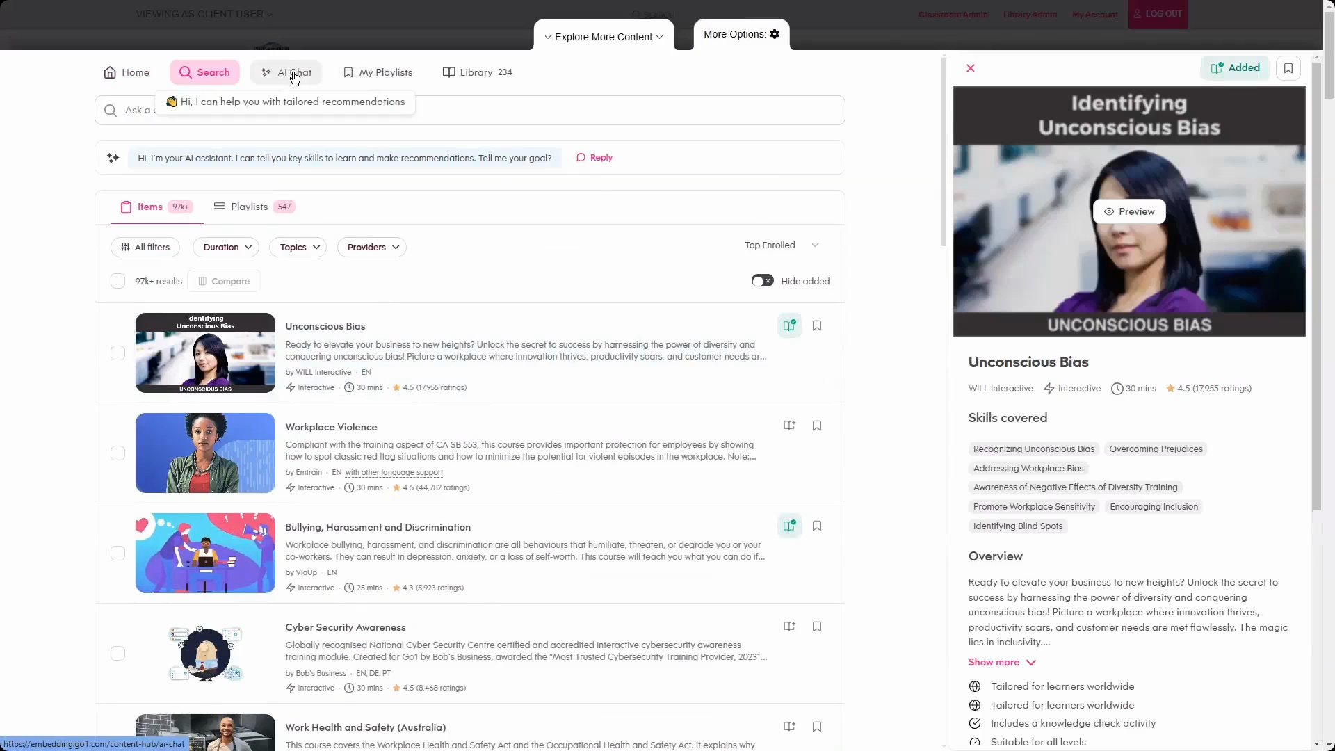 Leverage artificial intelligence to find the right courses and even gain insight into workforce skills. Powerful AI-enhanced search capabilities within the Content Library along with an interactive chatbot, can help filter and curate playlists to better support talent development and retention. Skills Insights provides development trends, learner satisfaction and content consumption, as well as industry-specific skills that are on the rise.